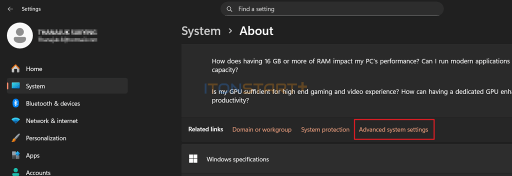 5. เลื่อน scroll bar ลงมาเล็กน้อย จะเจอคำว่า Advanced system settings