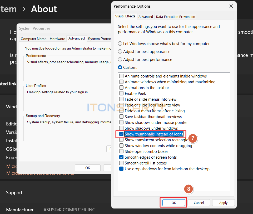 หลายๆ ท่านเคยประสบปัญหาช้าเพราะการแสดงผล visual effect บน Windows 11 จนทำให้เราจำเป็นต้องปิดการทำงานของมัน ให้เหลือเฉพาะในส่วนที่จำเป็นต้องใช้จริงๆ แต่ในที่นี้พอเราไปกดปิดหมดแล้ว รูปกลับแสดงเป็นไอคอนแทน ไม่โชว์เป็นรูปจริงในโฟลเดอร์ที่เก็บรูปของเรา สาเหตุเป็นเพราะเราไปปิดในส่วนนี้ร่วมด้วยนั่นเอง